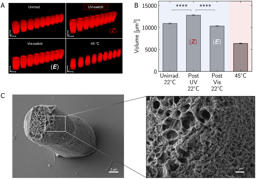 A new study by Cluster Doctoral Researchers Chantal Barwig, Malin Schmidt, Annabelle Sonn, Scientist Irene Wacker, as well as Principal Investigators Rasmus R. Schröder and Christine Selhuber-Unkel, explores a new type of microscale actuator made from soft, responsive hydrogels. These actuators can switch between two stable states without continuous energy input, a property known as bistability. The team created 3D microstructures that can be precisely controlled using two-photon polymerization by combining thermoresponsive and light-responsive components. This innovation opens new opportunities for energy-efficient soft robotics, biomedical applications, and reconfigurable microfluidic systems.