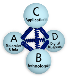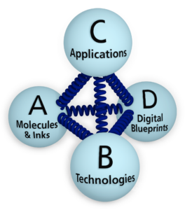 Research Area Molecules & Inks (A) focuses on designing and programming molecular building blocks such as inks and resists. Research Area Technologies (B) is concerned with advancing 3D Additive Manufacturing in terms of spatial resolution, speed, scalability, and multi-material processing. Together, these two areas provide the material and technological basis of the Cluster. Research Area Applications (C) builds on this foundation to realize functional devices and systems in materials science and the life sciences. Research Area Digital Blueprints (D) complements this framework by developing physics-based and data-driven approaches for modeling, simulation, and data analysis. These approaches enable the predictive and data-guided design of materials, processes, and applications.